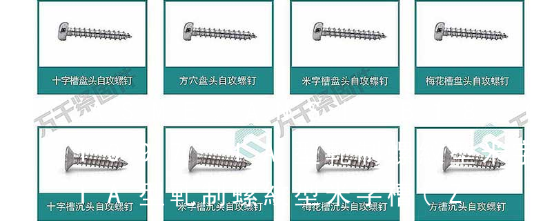 1、Flat:平頭 (鎖入后,頂部與工作件齊平)2、Oval:色拉頭、O頭、半沉頭 3、Round:圓頭 4、Pan:圓扁頭 5、Truss:大圓扁頭 6、Hex:六角頭 A-5:Finish Code/外觀處理。公制自攻螺絲 :于品名后方直接標示 Tapp 5.自攻螺釘:與機器螺釘相似,但螺桿上的螺紋為專用的自攻螺釘用螺紋。用于緊固連接兩個薄的金屬構件,使之成為一件整體 ,構件上需要事先制出小孔,由于這種螺釘具有較高的硬度,可以直接旋入構件的孔中,使構件中形成相應的內螺紋。這種