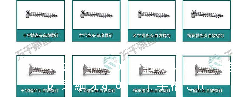 六角花形等;內扳擰:一字槽、十字槽H型、十字槽Z型、十字槽F型、四方槽、復合槽、內花鍵、內六角花形、內三角、內六角、內12角、離合器槽、六葉片型槽、高扭矩十字槽等。3、螺紋種類螺紋種類繁多,有自攻螺紋(